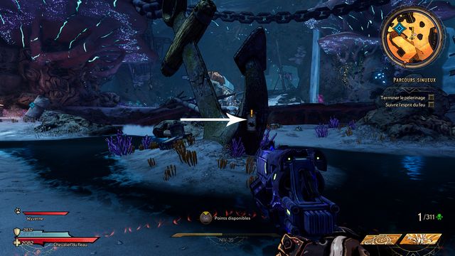 Montez l'escalier à gauche, laissez-vous tomber dans le trou un peu plus loin (photo ci-dessous à gauche). Récupérez "Le Bident" au centre (photo ci-dessous à droite).