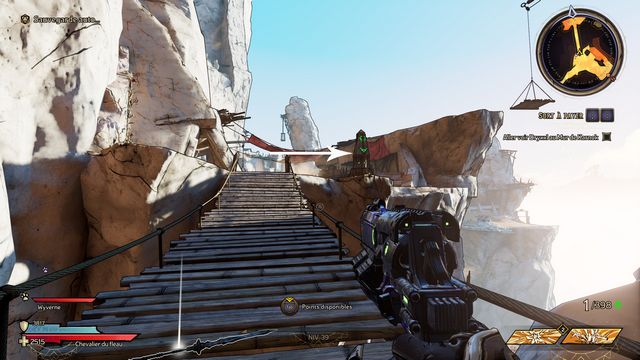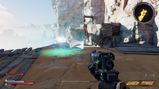 Vous pouvez désormais traverser le ravin. Vous rejoignez un pont cassé, tirez sur le quartz quand Mâtard vous le demande (photo ci-dessous à gauche). La plateforme descend, vous pouvez alors sauter dessus pour