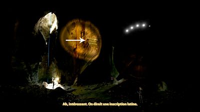 Pour ouvrir la porte, il faut trouver dans le noir des inscriptions gravées dans les murs (photos ci-dessous). Il y en a 5 en tout.