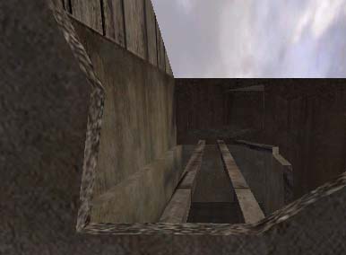 (Il faut rentrer dans les maisons pour accèder aux étages supérieurs). Traversez sur les deux planches puis descendez l'escalier. Continuez d'avancer jusqu'à ce que vous arriviez à une porte qui donne sur l'extérieur (photo ci-dessous - Vous voyez l'avion sur votre droite).