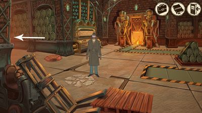 Utilisez le diamant sur la vitre du bureau (photo ci-dessous à gauche). Vous faites un trou. Cliquez sur le trou pour vous échapper du bureau. Rejoignez la salle des machines (photo ci-dessous à droite).