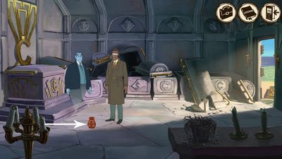Utilisez la tasse de café sur le Voodoo Detective. Vous devenez plus fort. Cliquez sur le coffre pour l'ouvrir. Vous êtes interrompu par Victor Fontule au moment de prendre la clé (photo ci-dessous à gauche).