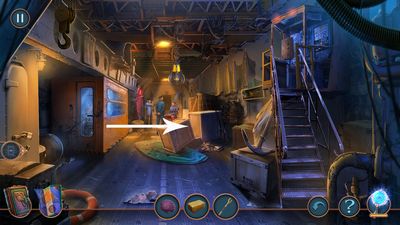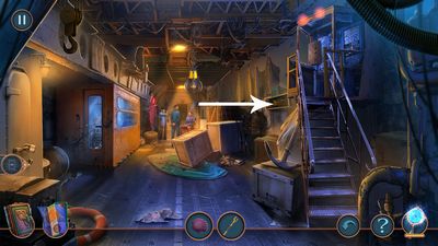 Cliquez sur la porte au loin (photo ci-dessous à gauche) puis utilisez la carte-clé dessus. Vous accédez au "port". Cliquez sur le bateau au premier plan (photo ci-dessous à droite).
