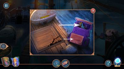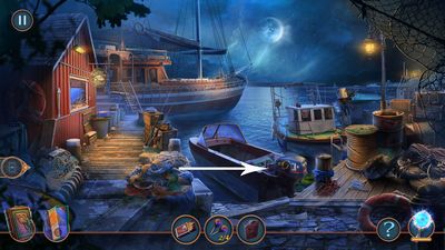 Cliquez de nouveau sur le bateau au premier plan puis utilisez le foulard et la tige métallique sur la grille (photo ci-dessous à gauche). Vous récupérez