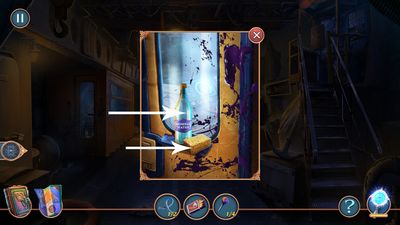 Retournez dans la soute puis cliquez sur la cabine à gauche (photo ci-dessous à gauche). Utilisez l'éponge et l'eau minérale sur la porte (photo ci-dessous à droite).