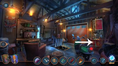 Il faut trouver les objets cachés (photo ci-dessous à gauche). Cliquez sur les fléchettes en "a", "b" et "c" pour pouvoir prendre la cible en "11". Utilisez le cric en "d" sur le tiroir en "e" pour pouvoir