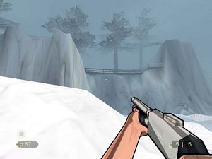 Continuez tout droit, vous trouverez une petite cabane en bois sur votre droite, prenez la trousse de secours puis revenez sur vos pas jusqu'au bonhomme de neige. Vous avez un passage sur la gauche qui passe entre les rochers enneigés, il vous permet de rejoindre la banquise (photo ci-dessous à gauche).