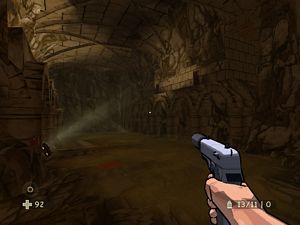 Regardez au plafond juste avant cette salle vous avez un point d'ancrage pour le grappin. Montez. Au bout du couloir, tournez à droite mais ne redescendez pas, restez sur le rebord et avancez tout droit. Vous arriverez à un autre point d'ancrage. Ce dernier vous permet de traverser pour rejoindre le côté des grilles qui sont fermées (photo ci-dessus à droite).